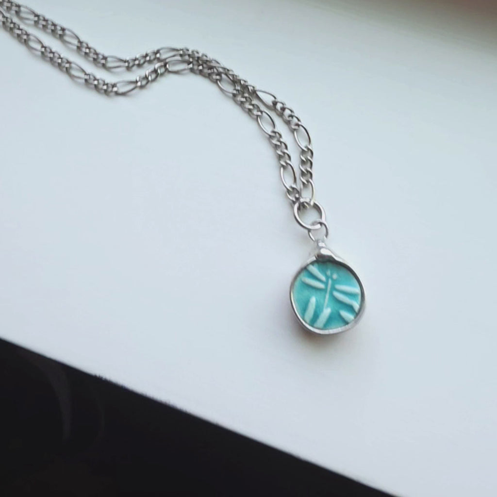 Small round ceramic dot pendant in a bright blue hue with a simple relief of a dragonfly that pops just enough against the glaze. It’s set in a silver finish and hangs on a fully adjustable figaro style chain, so it layers well or stands on its own without fuss. This one feels light, cheerful, and a little nostalgic… like something you’d find in a sunny art fair booth. Easy to wear, zero overthinking required. Handmade in my home studio.