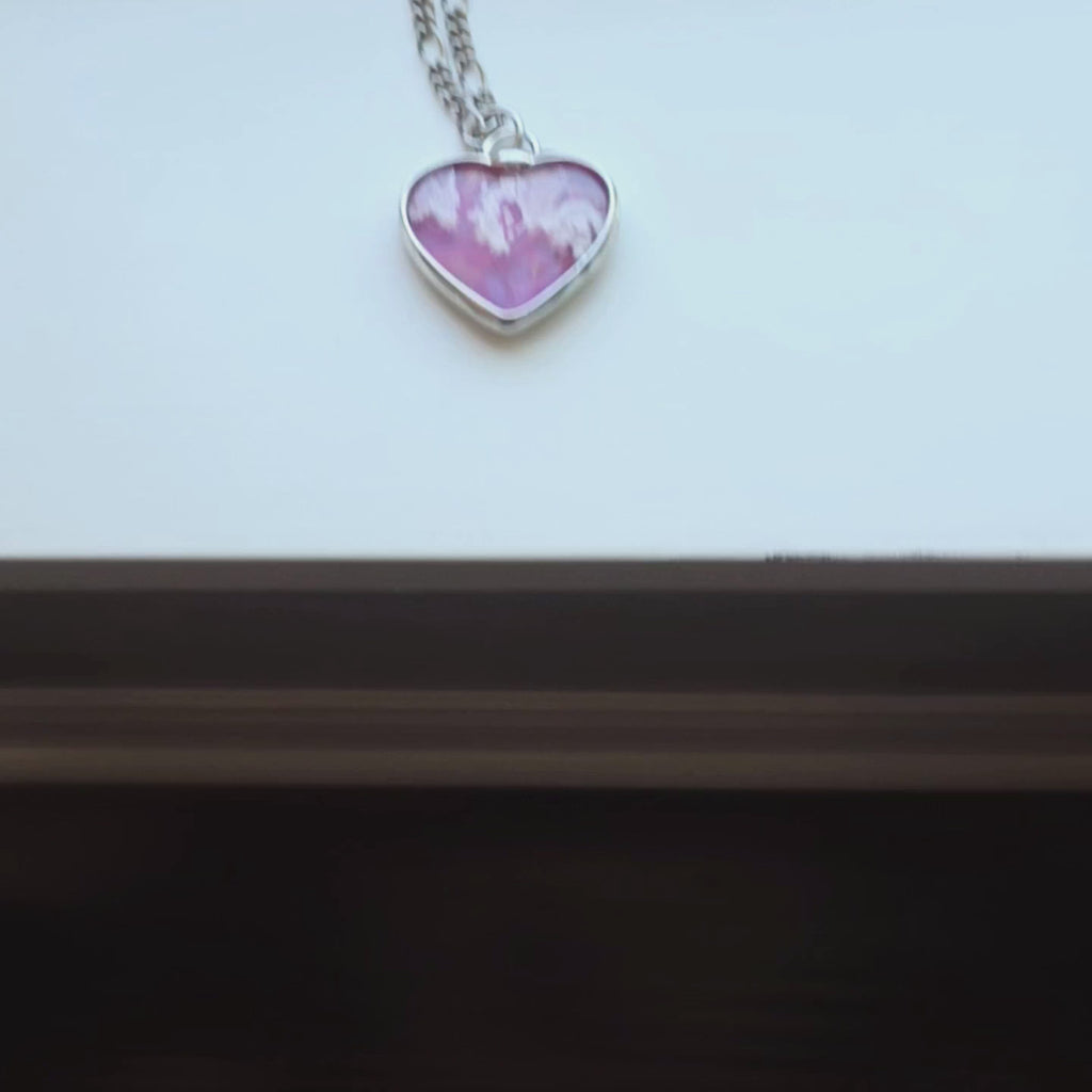 I’ve had this agate doublet heart sitting on my bench for a bit because it didn’t need fussing… just a good frame and some respect. The soft mauve and dusty pink tones mix with those cloudy white patterns in a way that feels a little vintage and a little accidental, which I love. It’s set in a silver finish and hangs from a fully adjustable figaro style chain, so it can sit right where you want it. Handmade in my home studio