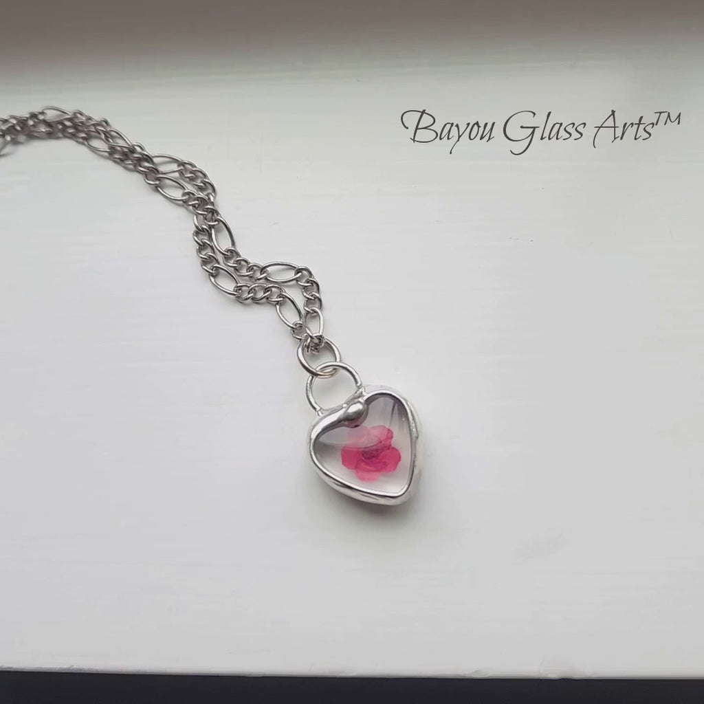 This little glass heart holds a real dried floret in a bright red tone. It is small, sweet and easy to wear, with a quiet bit of color that works for everyday outfits or as a little gift for someone who loves nature. Handmade in my home studio.