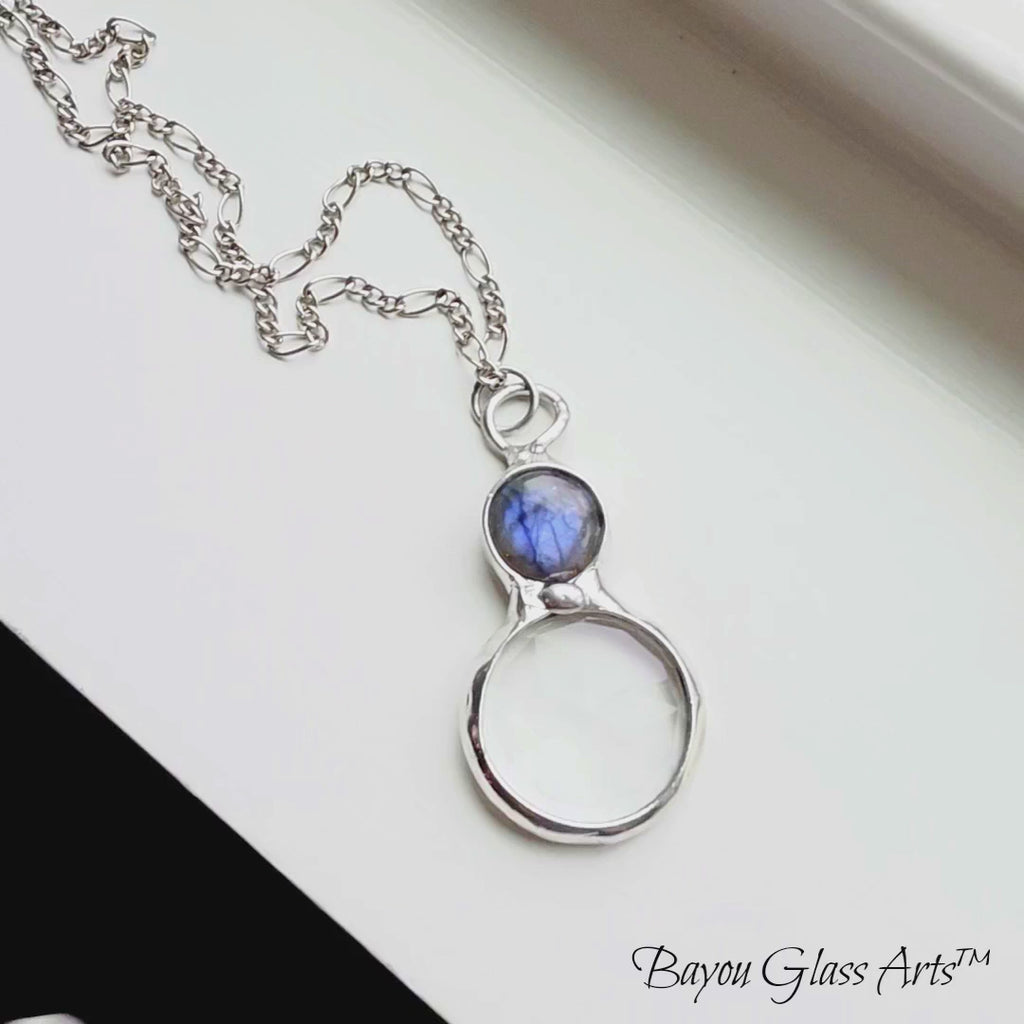 I paired a glowing labradorite inset with a faceted glass prism kaleidoscope because apparently I cannot leave well enough alone. The labradorite throws that electric blue flash when it catches the light, and the prism lets you peek through and see the world just a little differently. It is equal parts jewelry and built in distraction device. Yes, people will ask about it. No, you will not mind. Handmade in my home studio.