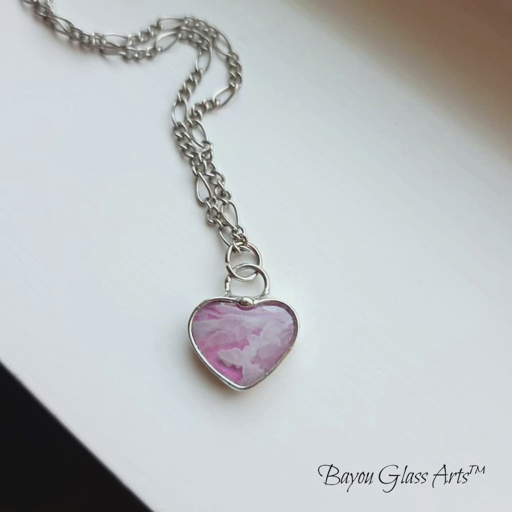 Pink heart shaped agate doublet with soft blush tones and milky white clouds that shift a little as the light hits it. Small but not shy. Set in a silver finish with a smooth heart outline that keeps it sweet without going full Valentine aisle. Fully adjustable figaro chain because this one likes options and refuses to commit to one length. Handmade in my home studio.
