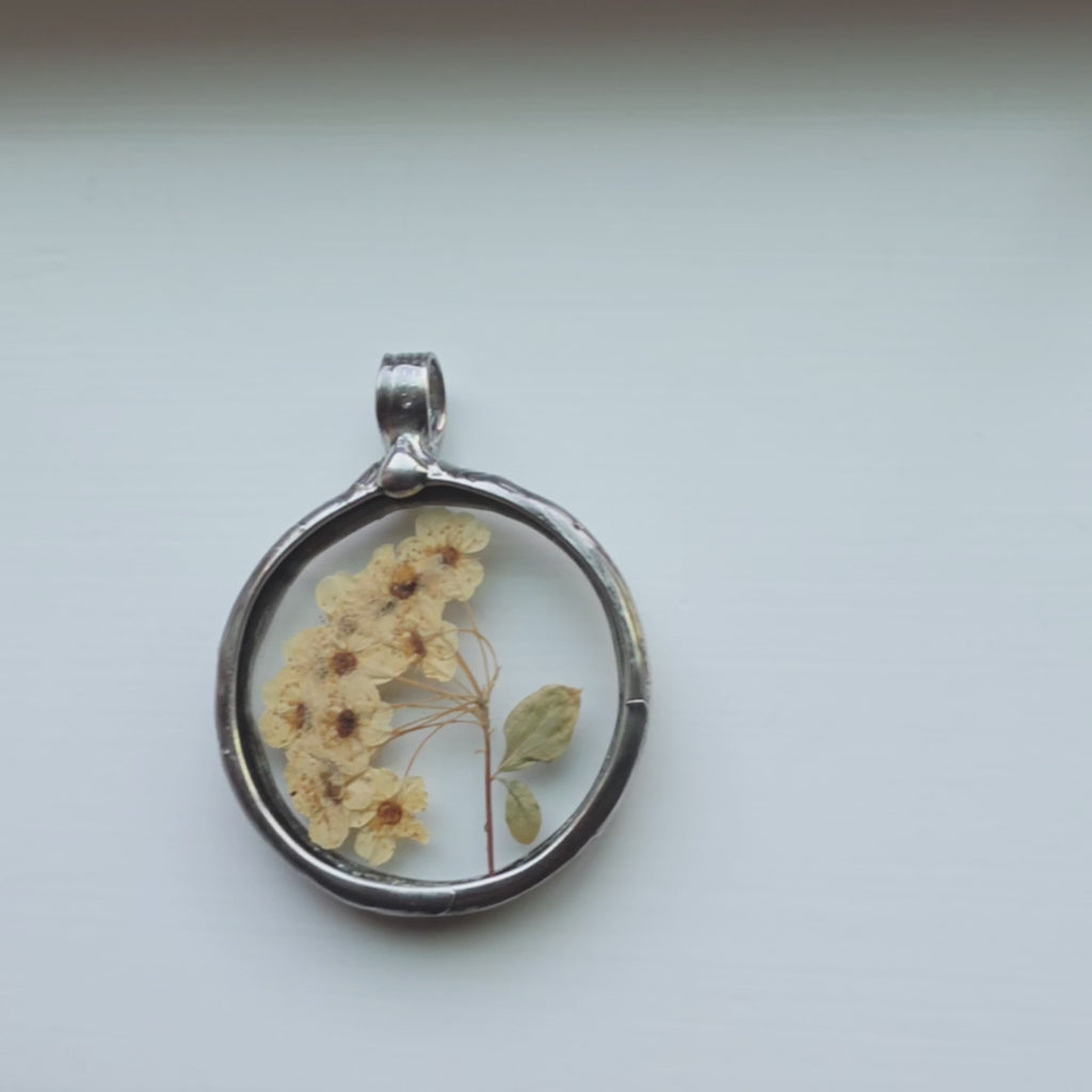 This pendant holds real dried Bridal Wreath flowers placed between glass, preserved just as they are… soft cream petals with darker centers. It’s a fair sized round glass pendant with a gunmetal finish, so while the flowers feel delicate, the piece itself has weight and intention. It’s the kind of necklace that gets noticed up close, where someone leans in, they realize they’re looking at real flowers, not just a pattern. Handmade in my home studio.