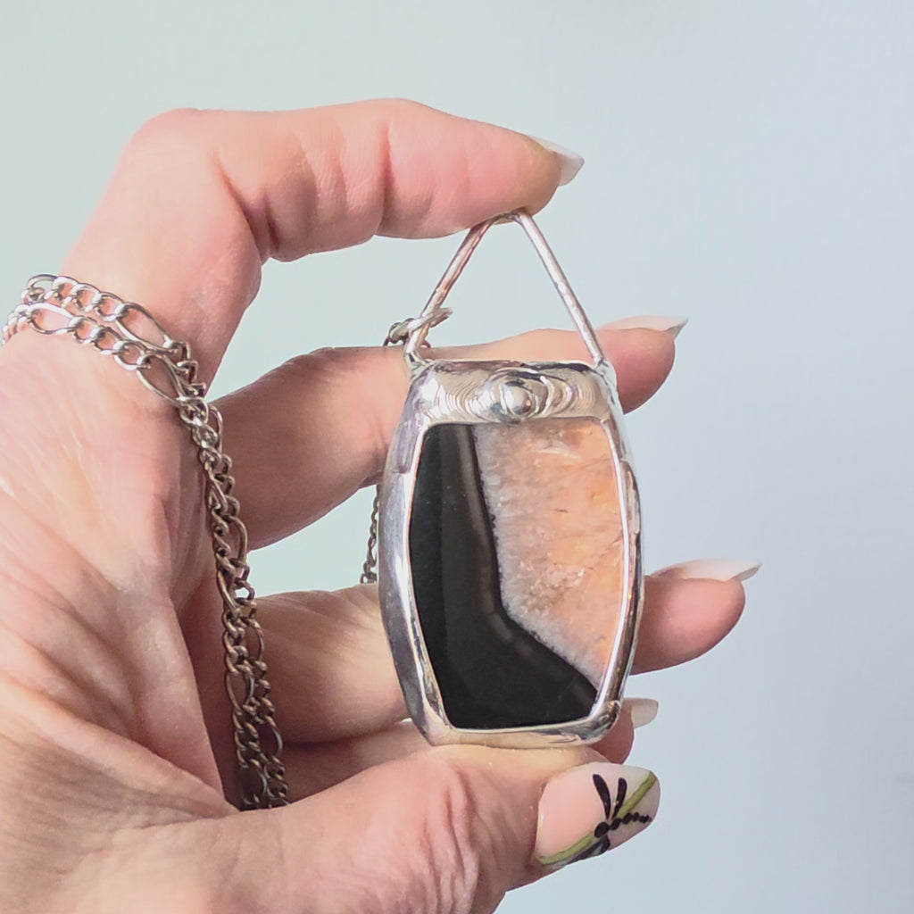 That bold sweep of deep black on one side and warm, coppery agate sparkle on the other… it is dramatic without trying too hard. The copper backing underneath gives the stone extra glow, especially in that lighter crystalline section. This large stone is set in a smooth silver finish, the shape is softly rectangular with a slight taper that keeps it interesting but still easy to wear. It feels solid in the hand and grounded on the neckline… not fussy, just strong.