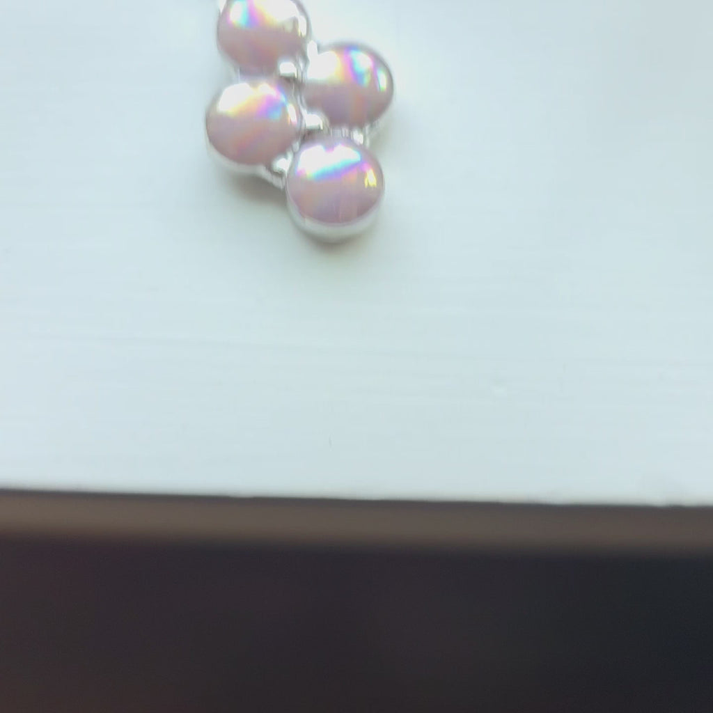 Here I set four soft pink ceramic glass dots into a silver finish cluster that feels a bit like a little polka dot pattern. The color leans pink with just a hint of purple and the surface catches the light with a gentle iridescent glow that flashes subtle rainbow tones as it moves. It is playful, simple, and just a little different... one of those pieces that makes people smile when they notice it. Handmade in my home studio.