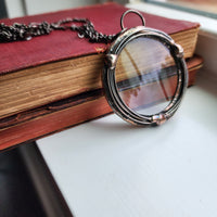 I tried my hand at creating a couple of magnifiers with an antiqued copper finish. This one I made wrapping copper wire, round and round, to create a frame for the magnifier. Though a little bright right now, they will gain a richer, darker patina. Won't find this type of jewelry anywhere. About 5x power, real glass, not plastic. Each are made by hand.